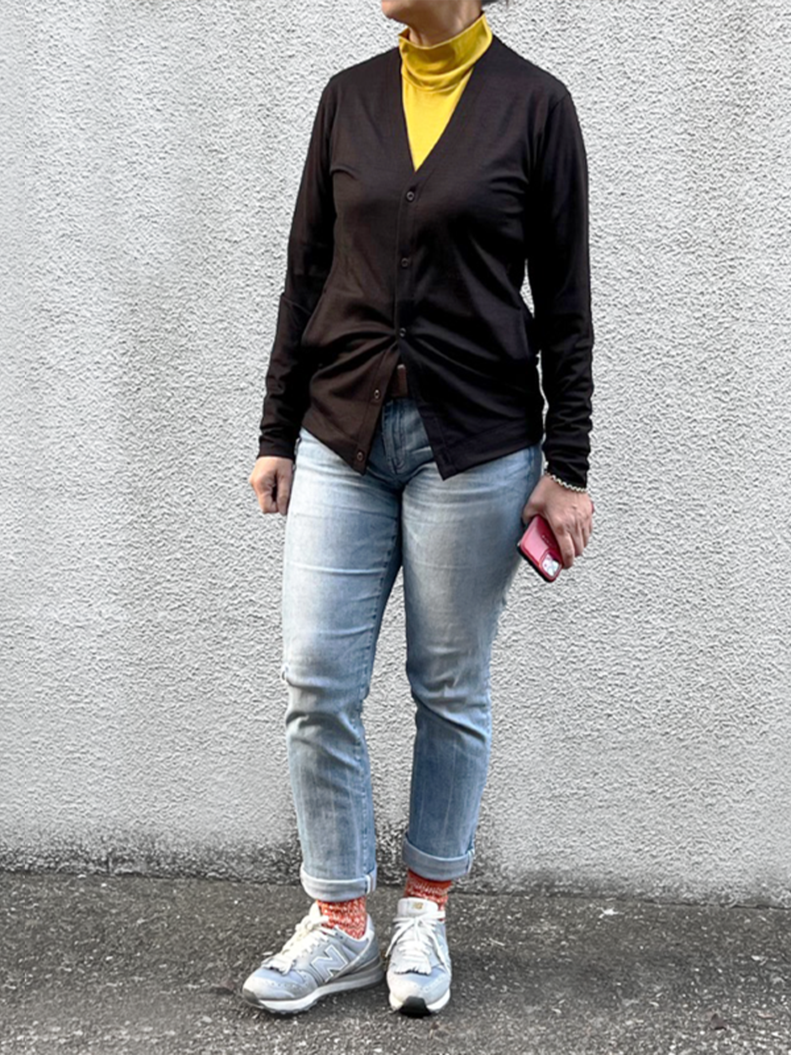「どう着こなせばいい?」お客様の声から生まれた、C BASIC メリノウールカーディガンのおすすめスタイルをご紹介します。**(身長と着用サイズも参考にしてください)**