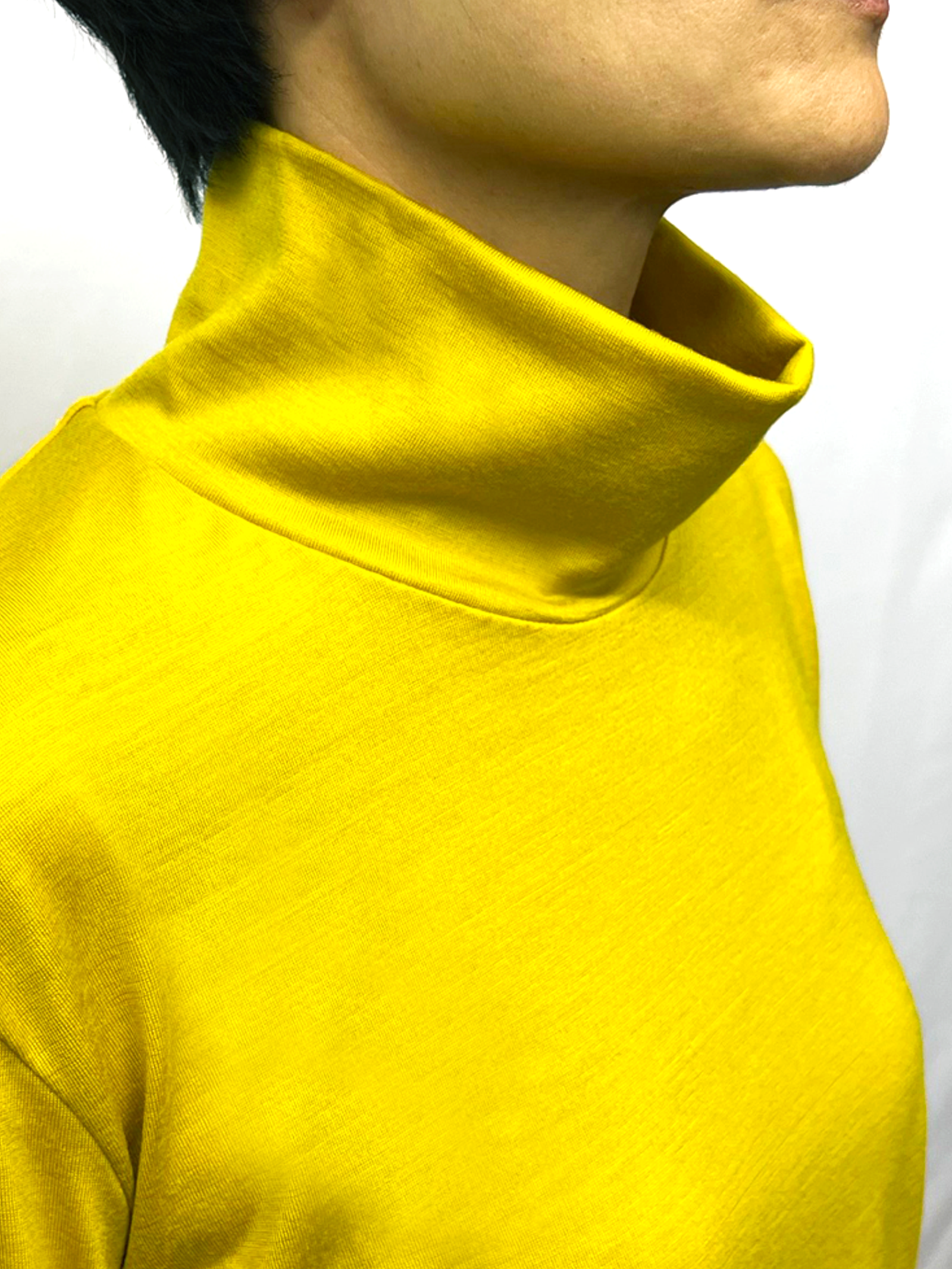 ゆとりのある襟なので、締め付けがなく程よい開き感。薄手なのに暖かく、ジャケットのインナーとしても最適です。