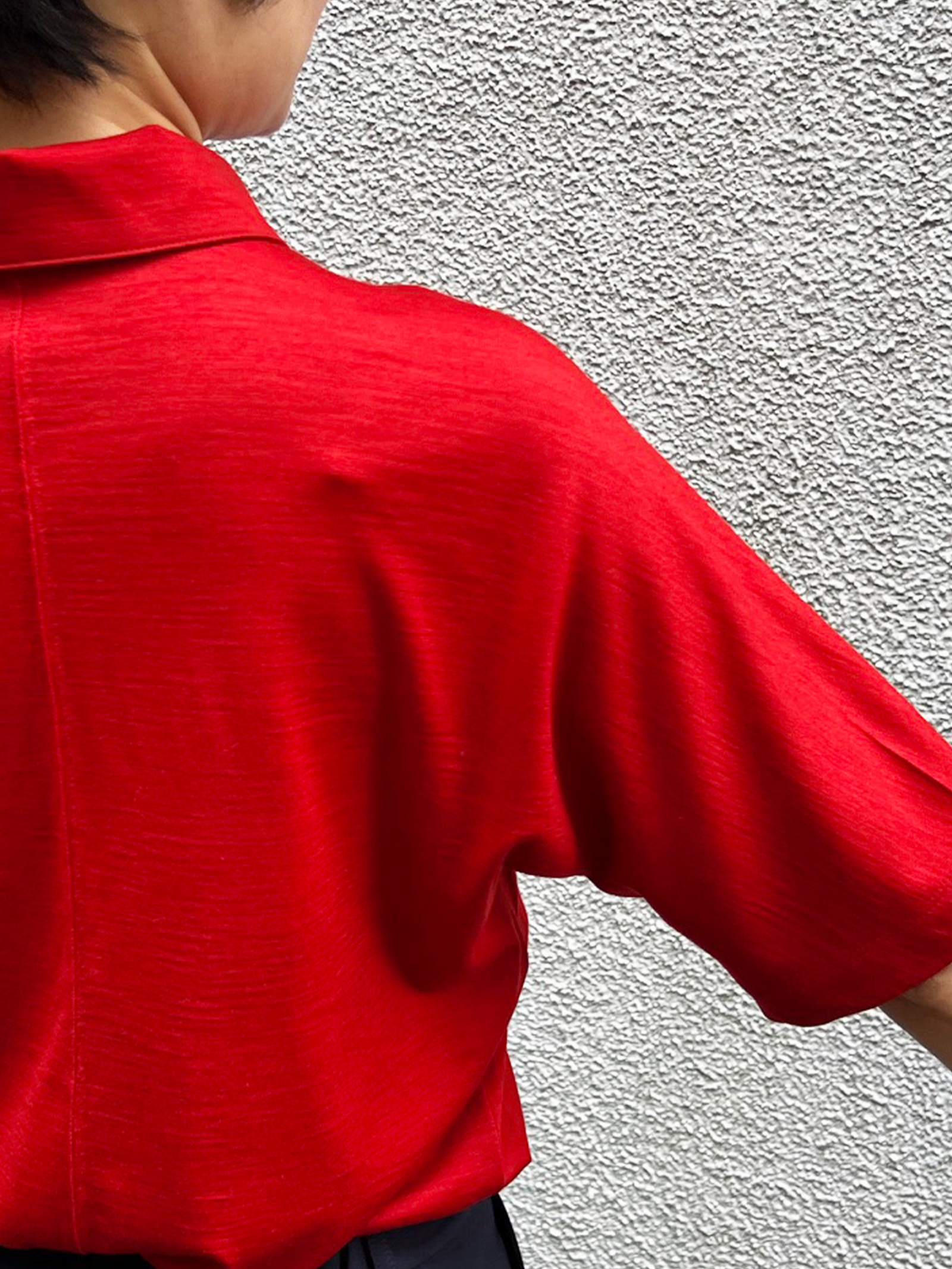 領型在第一顆扣子解開時,開口不會過大或過小,正是最有品味的視覺比例。以同布料製作,貼合且高雅。
