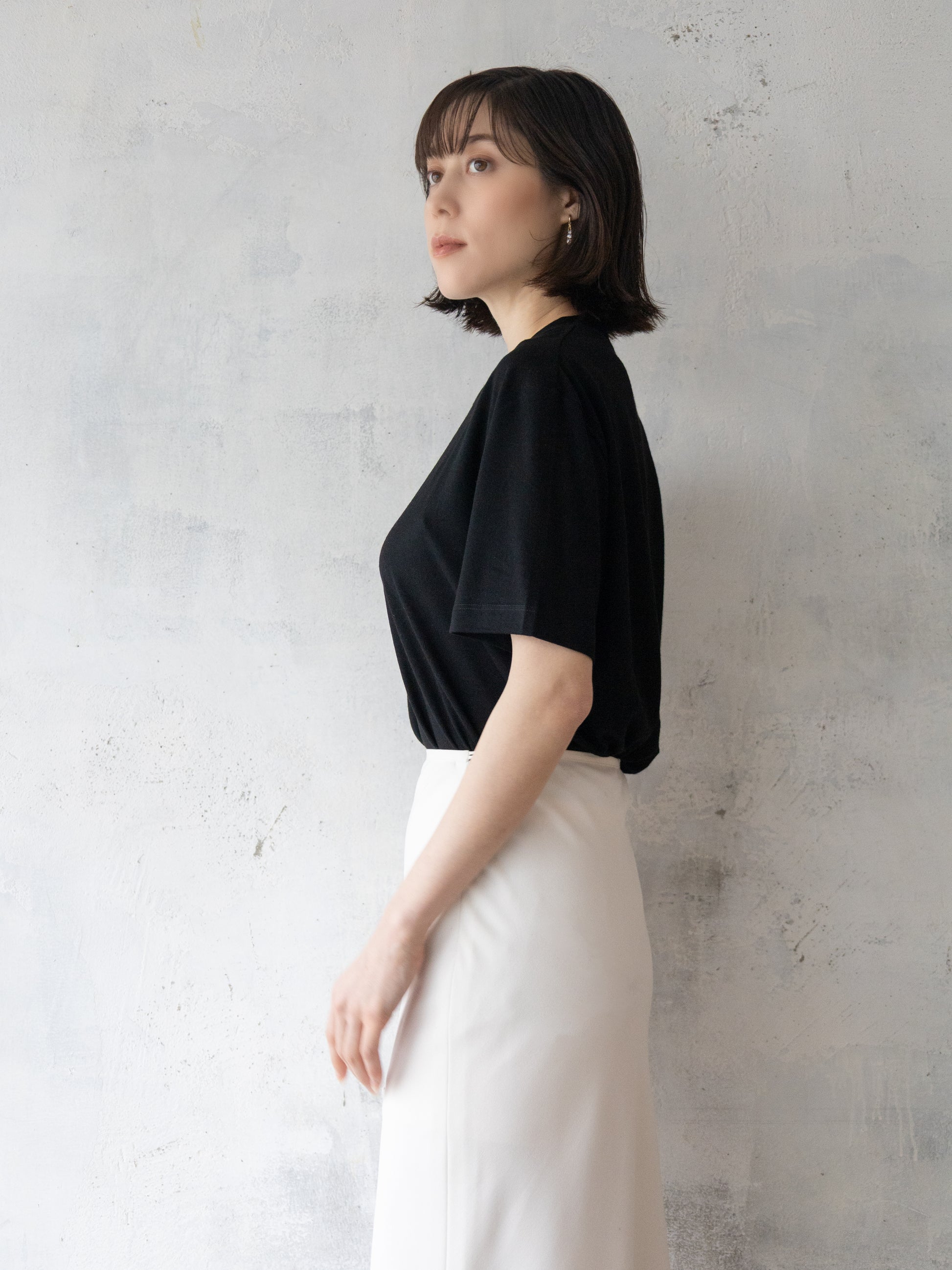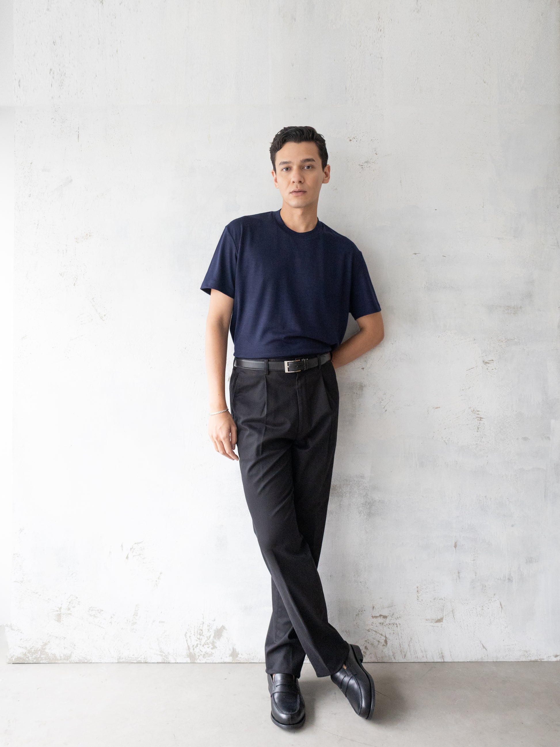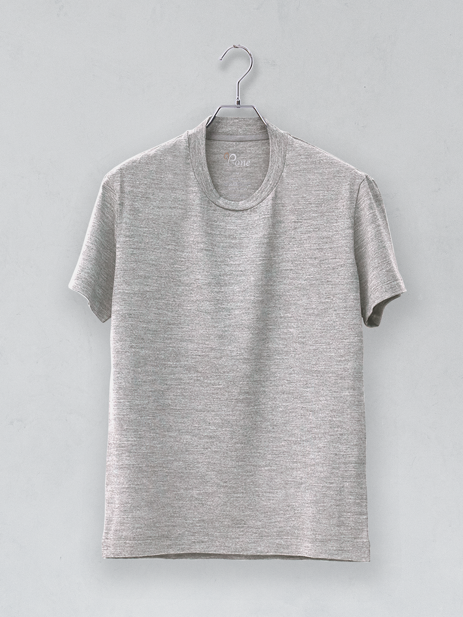 這款 T 恤採後領較高的領口設計,外套內搭可避免領口與頸部直接摩擦;面料使用細緻的 Super100's 美麗諾,觸感滑順、透氣不悶熱,日本職人工藝加持,從商務到休閒都能自在搭配。